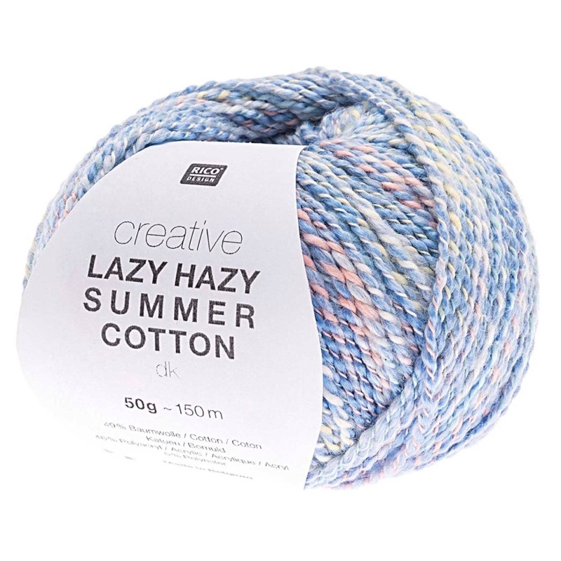 Rico Lazy Hazy Summer Cotton 008 Blauw is een meerkleurig garen en is samengesteld uit een dikkere draad die is omwikkeld met een gekleurde dunnere draad.  Dit geeft een extra mooi effect. Maak je volgende zomerse project met dit speelse garen in een kleurrijke katoen-acryl mix.  Dit garen is bijzonder geschikt voor het haken en breien van zomerse tops, vestjes, sjaals en omslagdoeken.  Laat je inspireren door de zomerse kleuren en ga aan de slag.